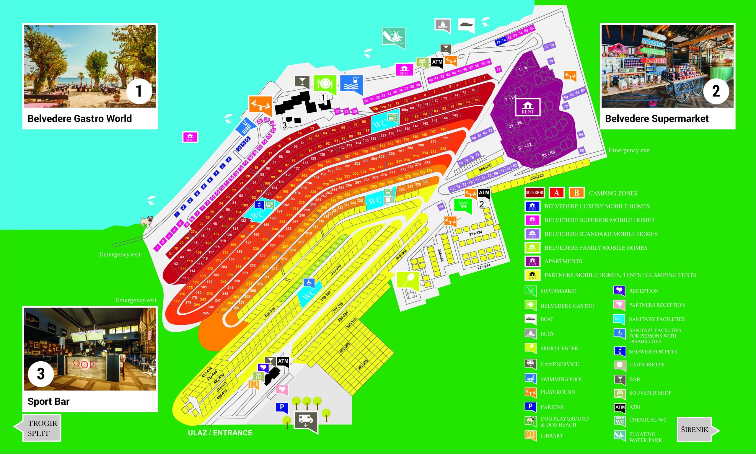 Ponudba kampa: restavracija, picerija, slaščičarna, več barov, market; v sezoni mini klub in animacija za odrasle, tenis, mali nogomet, namizni tenis. Glasbeni večeri v sezoni v kampu in v bližnjem Trogirju. Parkirišče: Za goste kampa je na voljo glavno parkirišče ob recepciji (vključeno v ceno).