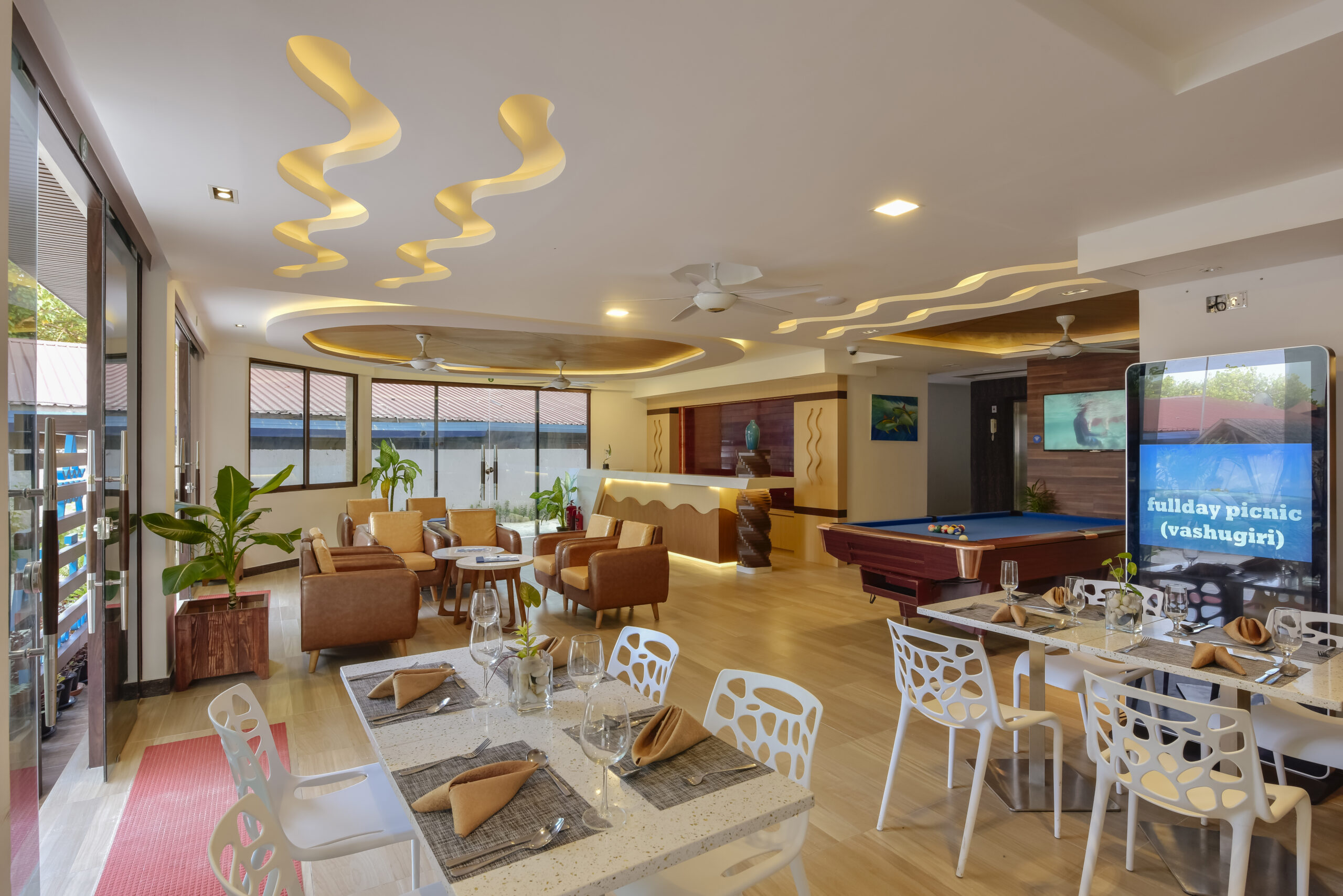 Aktivnosti: biljard, namizne igre, odbojka in nogomet na mivki, izposoja kanujev, koles, supov, 2 x na teden glasba v živo, velik izbor opcijskih izletih (snorkljanje, ribarjenje, potapljanje, plavanje z mantami ali skati, romantična večerja na plaži,..), brezplačen prevoz s čolnom do plavajočega bara (vožnja traja pribl.5 min)