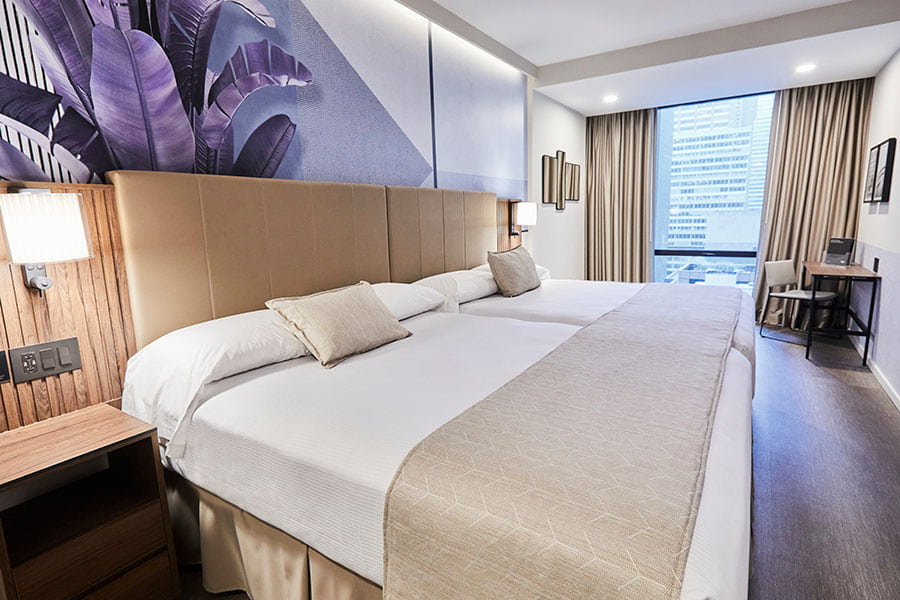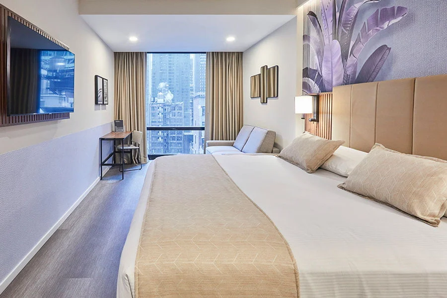 Deluxe superior soba: 18 m2. Prijetno opremljena soba zajema zakonsko posteljo, WIFI, SAT TV, klimatska naprava, sef in mini hladilnik. Sobe nudijo panoramska okna z neverjetnim pogledom na Manhattan.