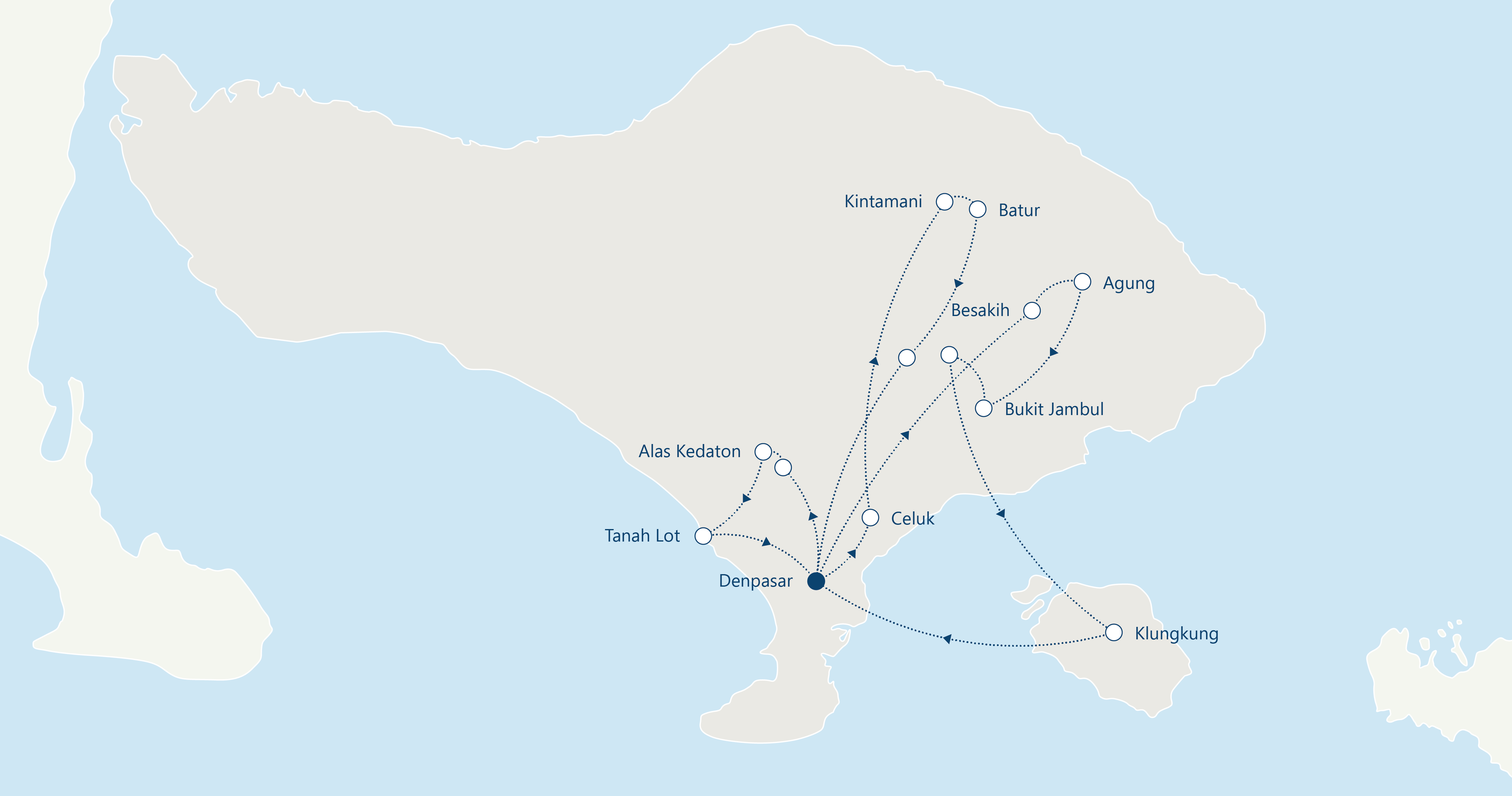Zbirališče potnikov na letališču Jožeta Pučnika v Ljubljani ali enem od bližnjih letališč. V primeru odhode iz drugega letališča za doplačilo možnost prevoza iz Ljubljane do letališča. Polet preko vmesnega letališča v Denpasar.