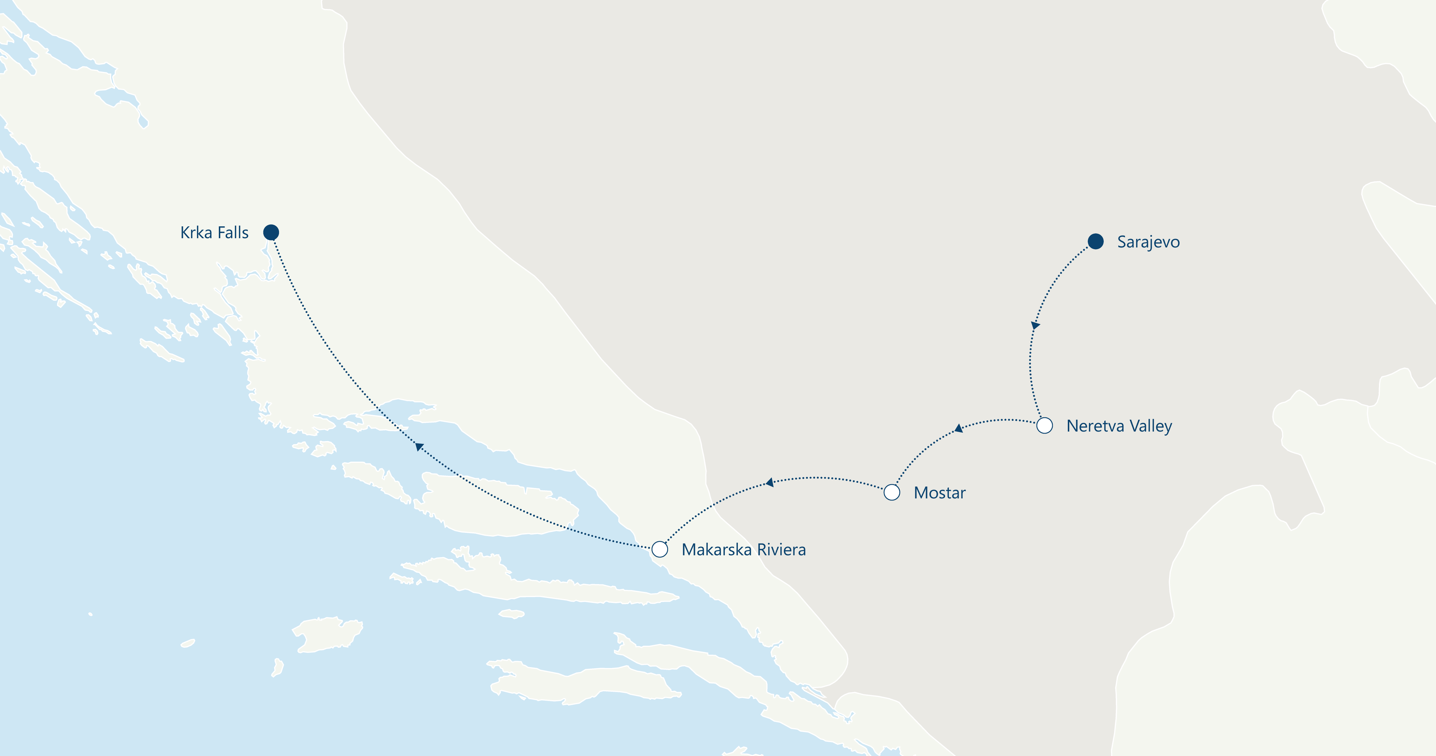 Raziskovanje čudovitega Sarajeva, v katerem se prepletata arhitekturi vzhoda in zahoda.  Mesto je živahno zvečer in tudi ponoči. V središču Hercegovine bomo obiskali Mostar, kjer se zanimivo prepletajo orientalski in mediteranski vplivi. Sprehajali se boste po starem mestnem jedru in občudovali atraktivne razglede na stari most. Slapovi reke Krke, kjer se prepletajo številna jezera, slapove in brzice so ena izmed najbolj pomembnih znamenitosti na Hrvaškem. Najbolj znan in turistično obiskan je slap Skradinski buk.